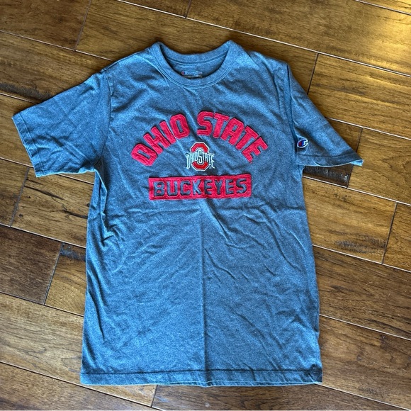 Ohio State Buckeyes tee by Champion. Features bold red lettering on gray fabric. Comfortable and sporty design.