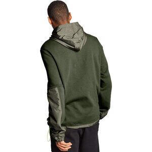 Cotton/Polyester material. Chest 40". Length 26". Double front closure, zip and other closure. Double hooded with fleece and polyester cover. Drawcord bottom hem. Front pockets. Long sleeve with elastic hem. Fleece lined. Sports. Travel. Outdoor.