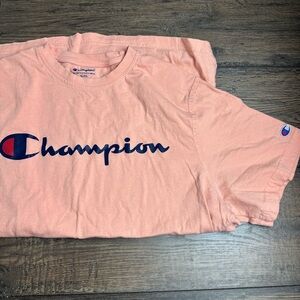 Soft light pink tee with Champion logo. Perfect for casual wear.