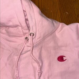 Soft light pink hoodie with drawstring and front pocket. Embroidered Champion logo on chest.
