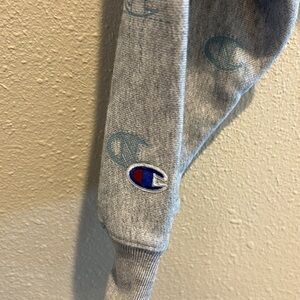 Champion Logo Print Reverse Weave Crop Hoodie Allover Print In Oxford Grey Sz. M