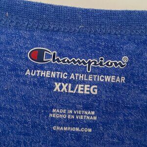 Comfortable, sporty blue, long sleeve shirt. It has the Champion script across the chest & the logo on the left sleeve above the cuff. Tagless at back of neck & care tag at hem. Feels like jersey knit. Made of cotton, polyester, & elastane. Condition is ‘Pre-owned’; great condition. Men’s size XXL. Can also by used by women.