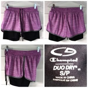 - Purple/black: Champion Duo Dry elastic waist with lining and drawstring.