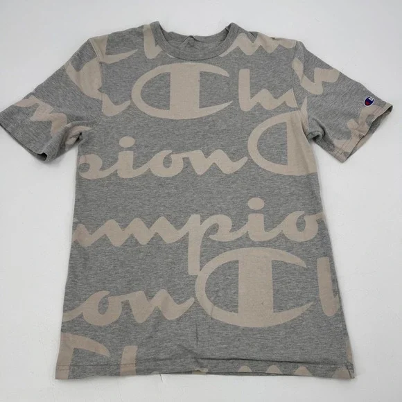 Keywords: Champion, T shirt, Mens, All Over Print, Crew Neck, Short Sleeve, Gray, Athletic, Casual, Comfortable, Logo, Graphic Tee