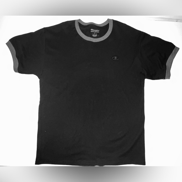 Classic black tee with gray accents. Features Champion logo on chest. Ideal for everyday wear.