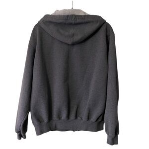 Long sleeves, slash pockets, full-length zipper and hood with drawstring. In excellent gently used condition.