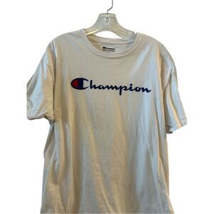 Keywords: Champion, men's t-shirt, large, white, graphic print, crew neck, short sleeve, cotton, logo, Honduras, pre-owned, excellent condition.