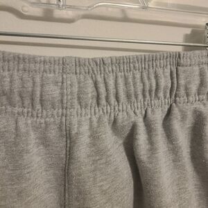 Men's gray, slouchy, athleisure fleece shorts by Champion, size 1XL. Front slant pockets and drawstring ties at waist. Champion logo down left side of leg on shorts. Cotton and polyester fabric blend. Comfy shorts are fleece lined and in excellent pre-owned condition overall; small smudge/stain on back of right leg. Please see close-up pictures for more details.