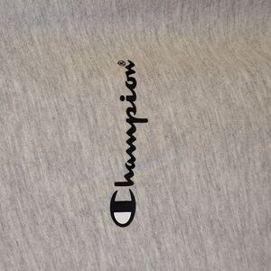 Heathered grey short sleeve T-shirt by Champion with black trim at neck and sleeves. Champion graphic on front left chest, and patch logo on sleeve. Size medium. Excellent condition. Cotton/polyester. PTP 21" - 24". Shoulder to hem 28 1/2"
