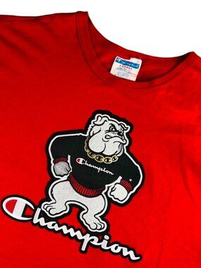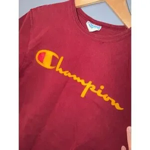 Classic Champion short sleeve t-shirt in a rich maroon burgundy hue. This essential piece features a prominent yellow raised script logo across the chest and the iconic embroidered C patch on the left sleeve. Crafted from a comfortable cotton blend, it offers a standard fit with a durable ribbed crew neckline, making it a versatile staple for casual wear or athletic activities.
