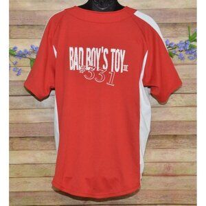 This vibrant red Champion jersey features a button front and short sleeves, designed in a stylish baseball style. Perfect for racing enthusiasts, it boasts unique Bullseye Racing and Bad Boy's Toy graphics, ensuring you stand out both on and off the field.