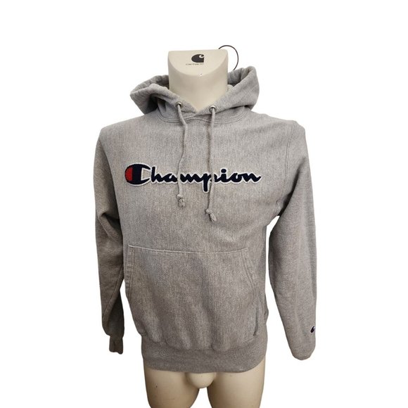 Description: Champion reverse weave hoodie. Spellout script patch logo.