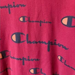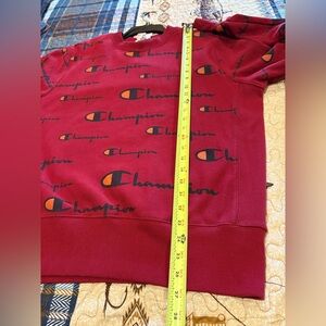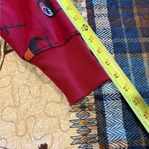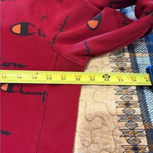 Champion Reverse Weave crewneck sweatshirt in a deep red color, featuring an all-over print of the Champion logo in black with an orange accent on the “C". This heavyweight fleece sweatshirt is known for its Reverse Weave technology, where the fabric is cut on the cross-grain to resist vertical shrinkage and enhance durability. It is crafted with a blend of cotton and polyester, providing warmth and comfort. Good condition. Mens M see measurements for accurate fit for you. Thanks for looking!