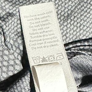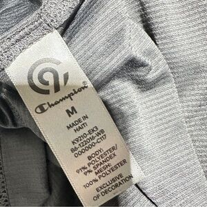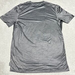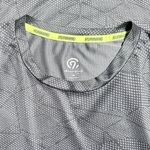 Champion men’s performance short sleeve running shirt in medium gray with a geometric textured pattern. Lightweight and breathable with stretch fabric. Reflective elements and mesh paneling for ventilation. Size M. Made in Haiti.