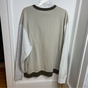 Really neat champion retro piece. Rib knit trim, fleece interior, color block pattern with one sleeve off-white and one heathered. Two embroidered logos. Great condition, gently used.