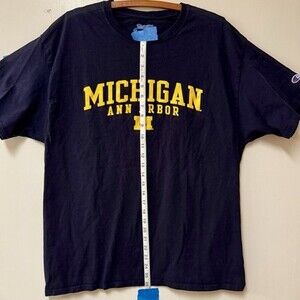 The Champion Michigan Wolverines Men's Extra Large T-Shirt in blue is a comfortable and stylish way to show support for the team. Made of cotton, this shirt is perfect for representing the Michigan Wolverines during the regular season. The shirt is designed for men in size XL, making it a great choice for fans looking to represent their favorite college team in a classic and versatile way. Made in El Salvador by Champion, this tee is a must-have for any fan of the Michigan Wolverines. MCA 109