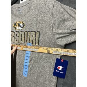 The product is a Champion Missouri Tigers T-shirt in men's size large, featuring the team's mascot in gray color. This short-sleeve shirt is perfect for fans of the Missouri Tigers football team, allowing them to show their team spirit with a stylish and comfortable apparel option. The Champion brand ensures high quality and durability, making it a great addition to any fan's collection.