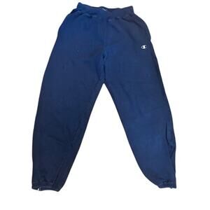 Classic navy Champion sweatpants in men’s size Large. Soft 90/10 cotton-poly, elastic waistband, side-seam pockets, elastic cuffs, and zip openings at both ankles for easy on/off over shoes. Made in Mexico. Good preowned condition with typical wash wear/light lint; no holes or stains noted. Freshly laundered and ready to wear.