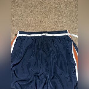Comfortable navy sweatpants with striking orange and white side stripes. Ideal for casual wear.
