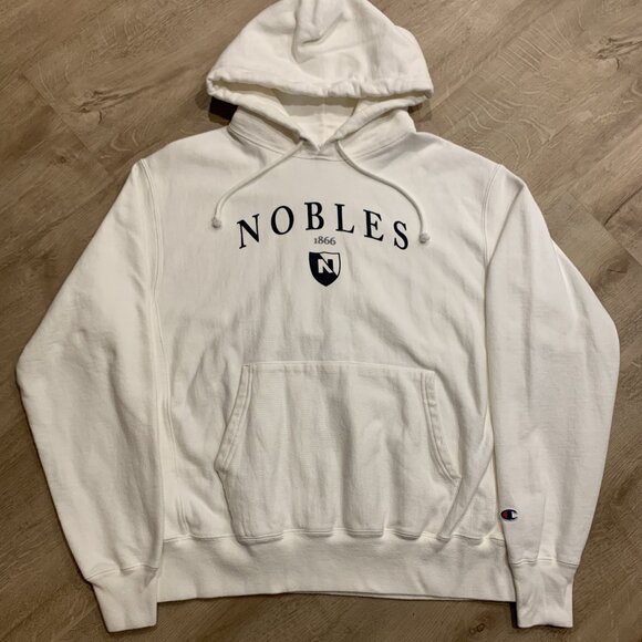 Champion Noble and Greenough School Reverse Weave Nobles Hoodie Men's Large L White Pullover Collegiate Spell Out Dedham Massachusetts Heavyweight Sweatshirt
