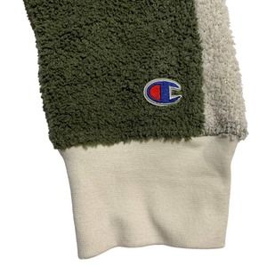 Cozy olive green sweater with cream accents. Features a hood and drawstrings. Champion logo on chest and sleeve.