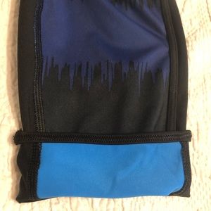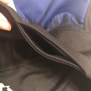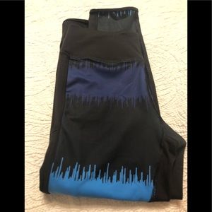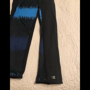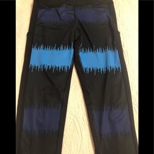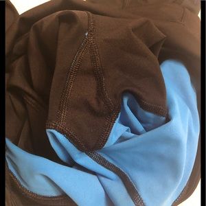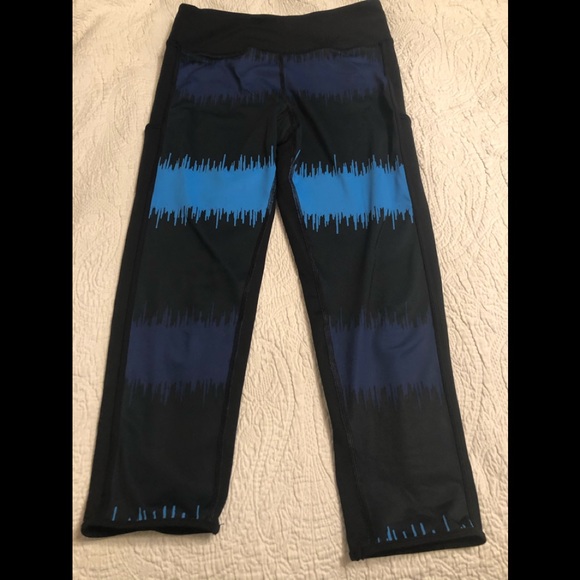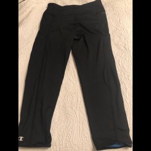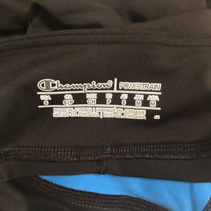 ChampIon Powerflex Powertrain Capri pants. Worn a couple of times. Still in great shape. These have sky blue and navy blue on black capris. Inside of front legs has the blue sky color. I rolled them up to see the color. The also have little blue stripes at the bottom end. Side pockets, not very wide. Key or CC holder.