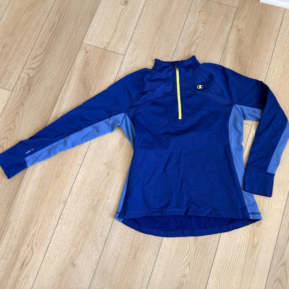 Champion activewear sweatshirt in purple with neon yellow zipper in Like New condition. Ideal for sports, workout or casual outings. Size L, somewhat snug around shoulders and arms. May fit better as a medium.