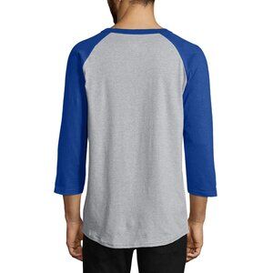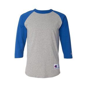 This Champion Raglan Quarter Sleeve Baseball T-Shirt features a stylish gray and royal blue design. Perfect for casual outings or sports events, it offers comfort and functionality with its soft fabric and classic fit. Ideal for men who appreciate sporty yet fashionable apparel.