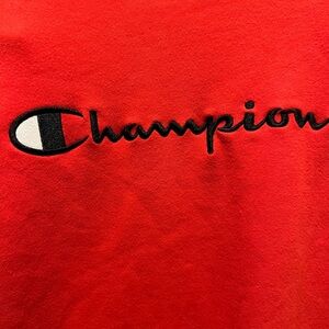Vibrant red Champion sweatshirt with embroidered logo on the front.