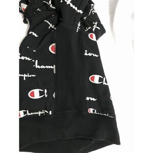 Champion pullover hoodie in black with allover logo print. Features embroidered “C” logo on sleeve cuff and drawstring hood. Tagged Small. Soft fleece interior. Great for streetwear, casual layering, or branded athletic style.