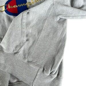 Champion Reverse Weave Big C Hoodie. Men’s size medium. Gray with a Big C logo and spell out Champion embroidered patch across the front.