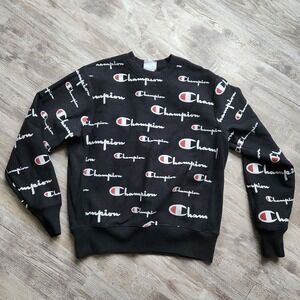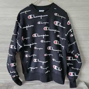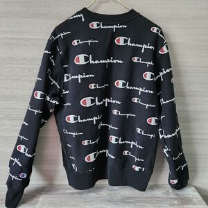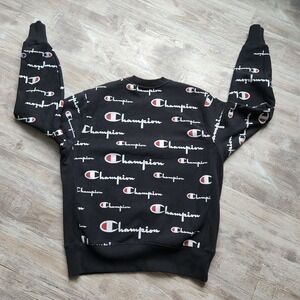 Champion Reverse Weave Heavy Crew All Over Logo Sweatshirt Black Panel Sides Lg