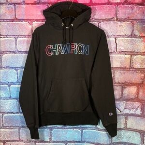 Classic black Champion Reverse Weave hoodie featuring bold CHAMPION embroidered spellout in red, white, and blue. Size Medium. Premium heavyweight cotton construction with ribbed side panels and cuffs for that iconic fit. Great for streetwear or athleisure. Made in Vietnam. Logo patch on sleeve, front kangaroo pocket, and drawstring hood.