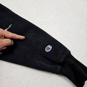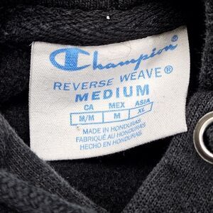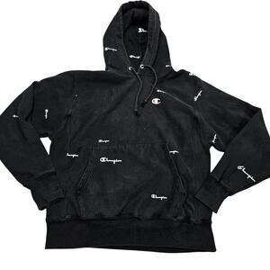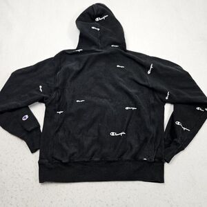 Champion Reverse Weave Hoodie Medium Black All Over Print Logo Drawstring