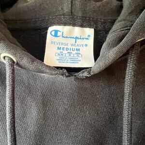 Champion Reverse Weave hoodie features a varsity style C logo on chest and Champion stitching on sleeve. Small distressing around neck (see pictures). Adorable retro style piece!