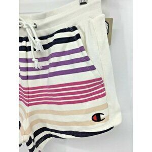 A women's pair of shorts from Champion from Urban Outfitters in a reverse weave candy stripe style. The shorts has a drawstring waist, pockets, and are new with tags