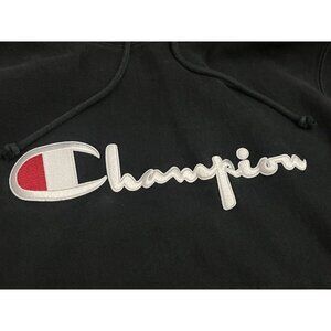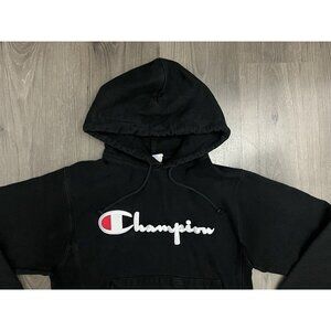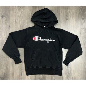 Champion Reverse Weave Sweatshirt Black Small Spell Out Hoodie Hood - Fade