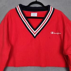 Champion Reverse Weave Sweatshirt Womens Large Red Cropped V-Neck Pullover
