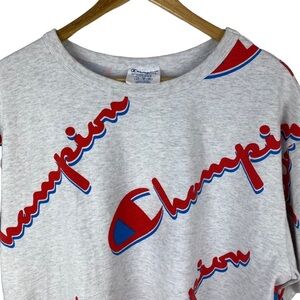 This is a Champion Reverse Weave tee t-shirt. Short sleeves. Gray base with red spell out logo. Crew neckline. 100% cotton. Cropped design. Women’s size XL or extra large. Bust 22”. Length 20”. Excellent condition.