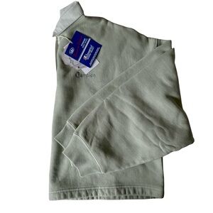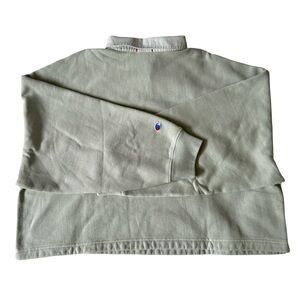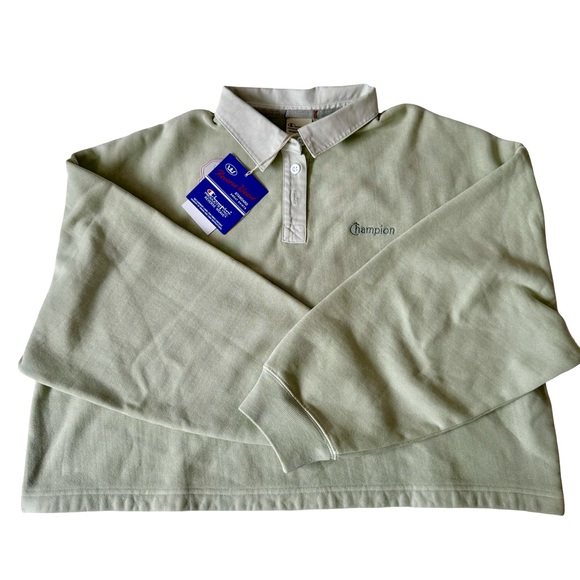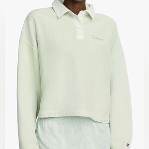 Champion Reverse Weave Riley Rugby long sleeve shirt in sage green. Features a classic polo button-up collar and left chest embroidery. Cropped length, relaxed boxy fit.