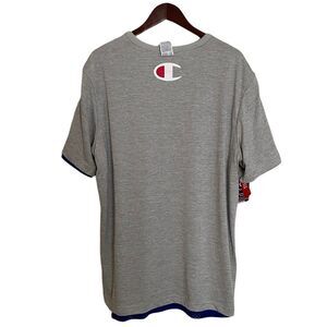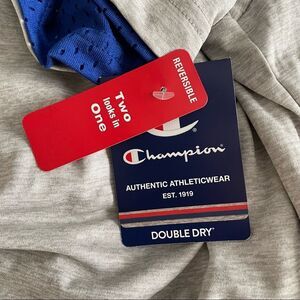 NWT! 2 sided athletic tee that switches from understated to statement by simply turning it inside out. Classic athletic surf blue mesh body on 1 side, & a knit in heather grey on the other side. DoubleDry moisture management wicks away sweat. Crewneck has a double-stitched ribbed band. C patch on left sleeve of mesh side. Champion text logo on mesh side & C logo on heather side at top of back. Regular fit. Last photo is a stock photo to show fit only. Size XL. Approximate measurements lying flat: 23” from pit to pit & 31” from shoulder to hem. Bundle to save big!