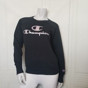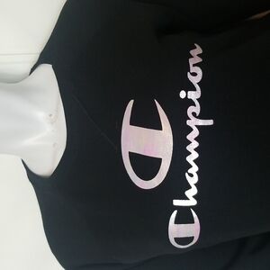 Keywords: Champion Black Pullover Sweatshirt with Irredescent / Holographic Logo Athletic Athleisure Comfy Cozy