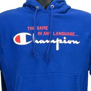 Champion Same In Any Language Hoodie Mens S Small Blue Hooded Sweatshirt Logo