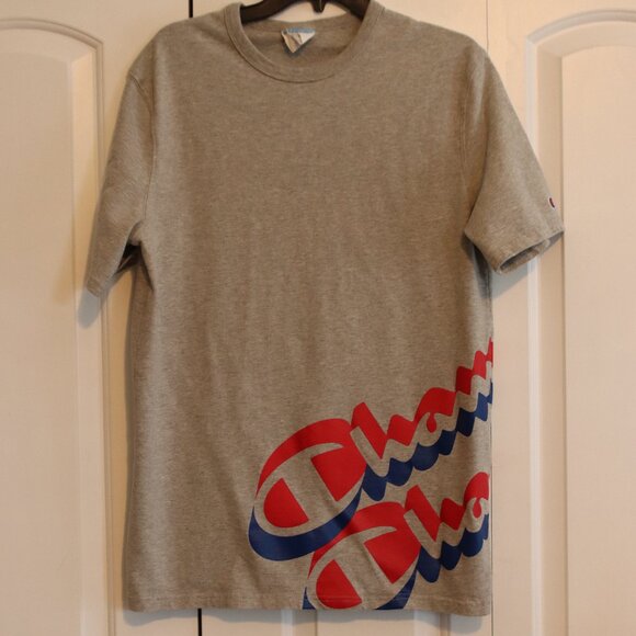 Champion Script Logo Wrap Around T-Shirt Heather Grey Short Sleeve Size Large