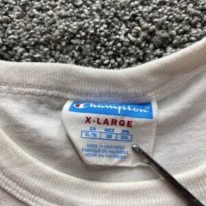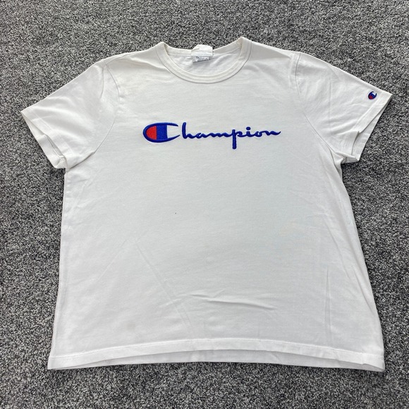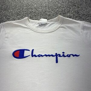 Champion Shirt Mens XL White Blue Applique Logo Short Sleeve Casual Grunge Y2K