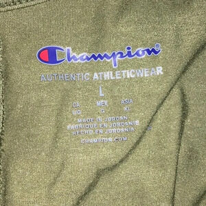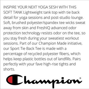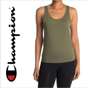This Champion tank top features an olive green color, tank top straps, a twist tie back, and a scooped back.