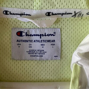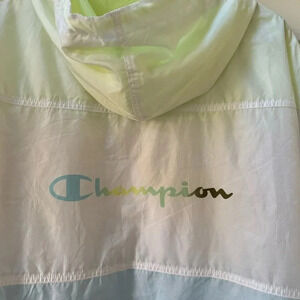 IT'S A SHEER PLEASURE TO WEAR THIS JACKET Silky ripstop nylon jacket defies the wind and rain. Lightweight, translucent shell takes on the elements and lets the colorblocked mesh lining shine through. Hood with breathable mesh lining and logo tipped drawcord. Chunky zip front and mesh-lined front pockets. Standout gradient logo on the back and embroidered logo on the chest for authentic Champion style.