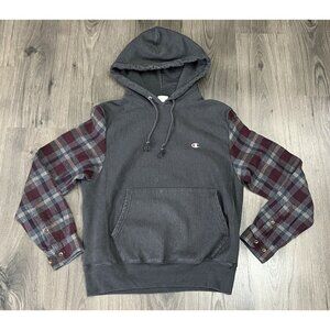 Preowned Champion Reverse Weave Hoodie Sweatshirt with Plaid Flannel Sleeves