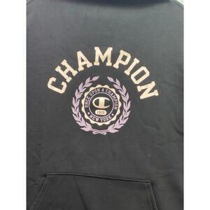 Keywords: Champion sweatshirt, pullover sweatshirt, women's sweatshirt, black sweatshirt, mock neck sweatshirt, button detail sweatshirt, logo sweatshirt, casual wear, athletic wear, loungewear, comfortable sweatshirt, long sleeve sweatshirt, purple logo