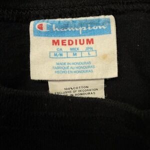 Keywords: Champion, T shirt, Medium, Black, Spell Out Logo, Short Sleeve, Casual, Menswear, Cotton, Athletic, Retro, Classic, Comfortable